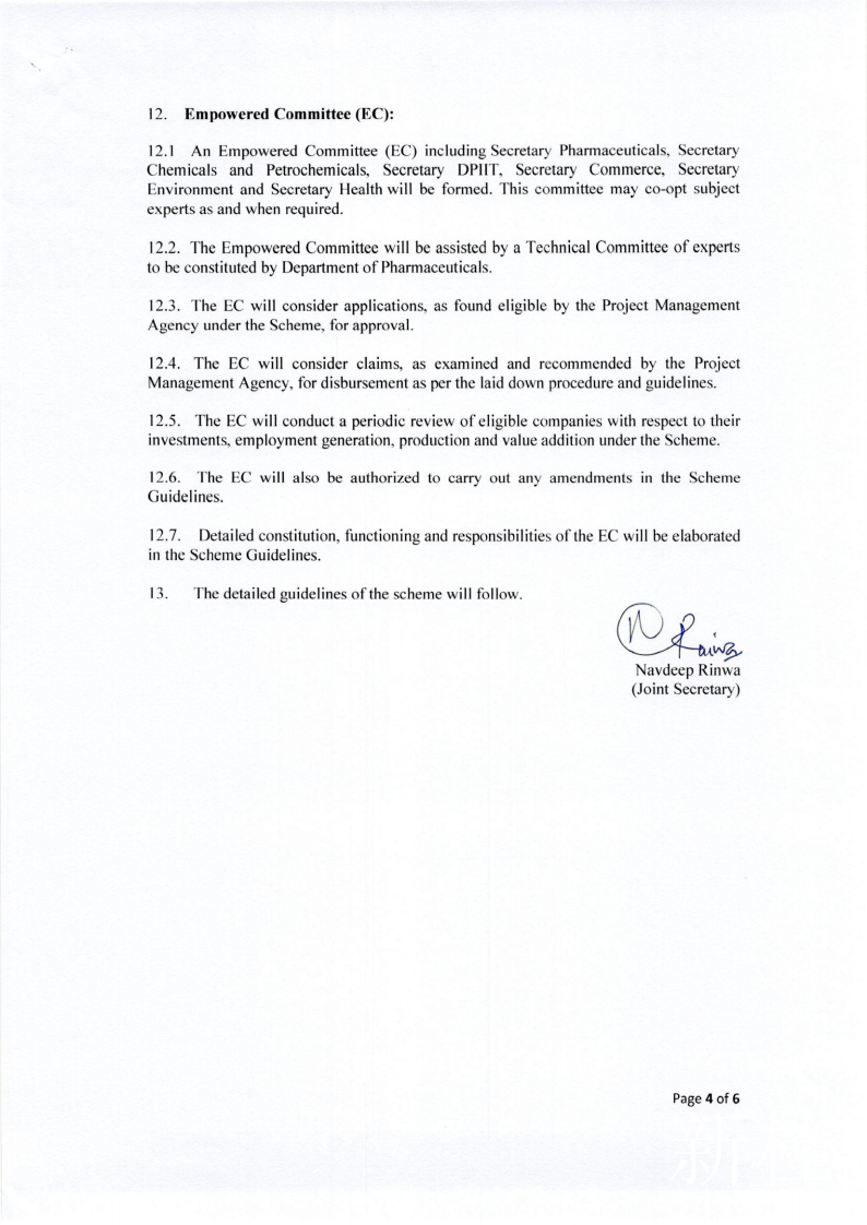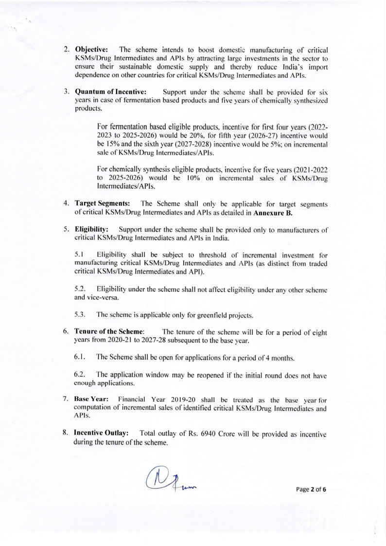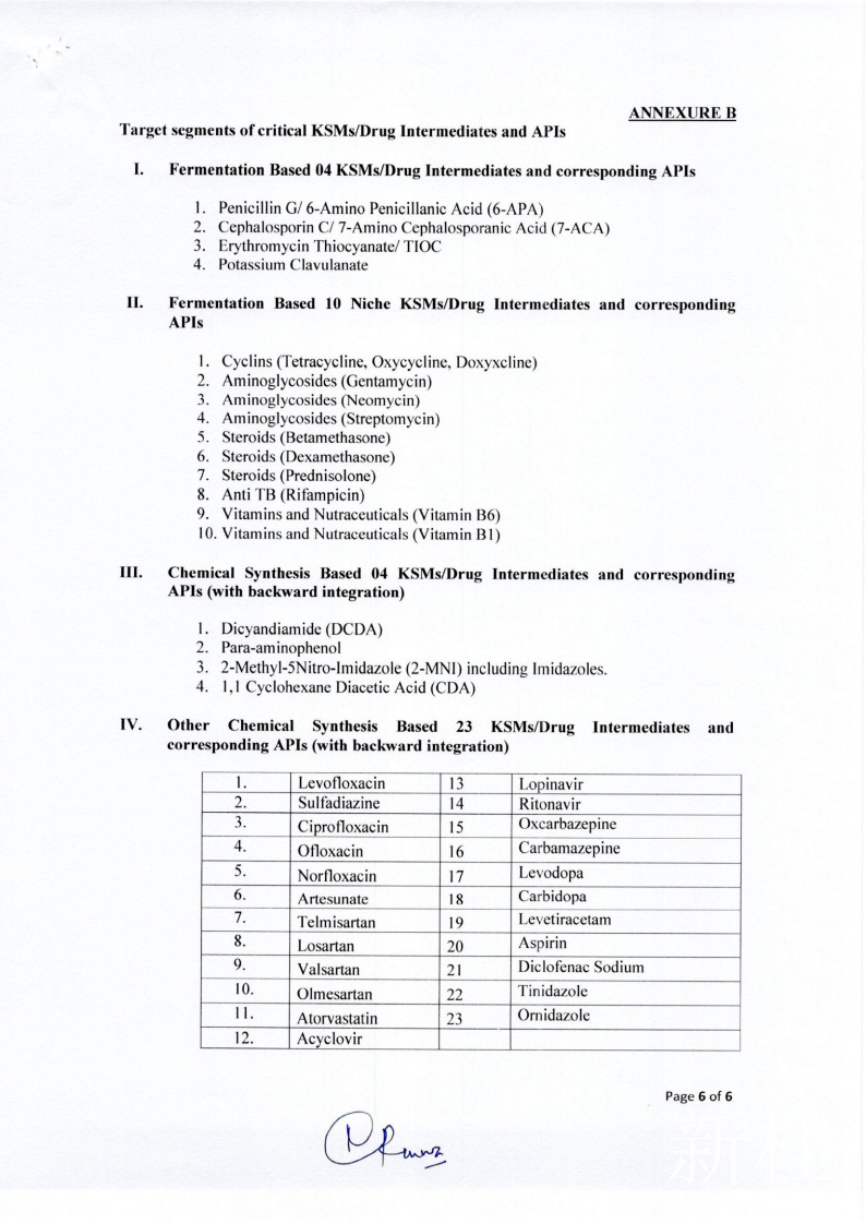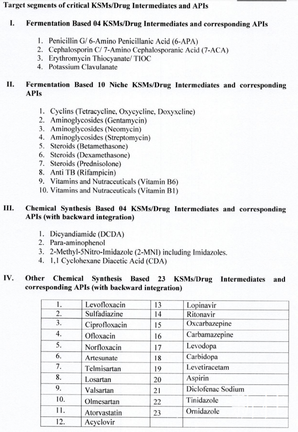 根据最终指导方针,该计划可能会将制药业分为四个部分。第一部分涉及“四种基于发酵的关键起始原料(key starting materials, KSM) 产品”的生产,这些产品用于制造最畅销的抗生素,包括青霉素和克拉维酸。将选出八名受益人,总激励额为360亿卢比,对每位参与者奖励20%。 第二部分涉及“ 10种基于发酵的利基(补缺)KSM和API产品”,包括新霉素,庆大霉素,维生素B1,四环素,强力霉素和倍他米松。在这里,将选择20个受益人,以获得价值100亿卢比的奖励,每位参与者的奖励总额为20%。在第三部分中,“ 4种基于化学合成的KSM或API产品”吸引了960千万卢比的奖励,每种奖励将分别给予10%的奖励。最后一部分将吸引138亿卢比的奖励用于“ 23种基于化学合成的KSM和API产品”,包括心血管用药缬沙坦,阿托伐他汀,氧氟沙星抗生素,抗HIV药物利托那韦和洛匹那韦,维生素B6和阿司匹林。每位玩家将获得10%的奖励。政府还将根据该计划宣布每个参与者的强制性最低产能。例如,青霉素的最小生产能力为5,000吨,而克拉维酸的最小生产能力为15万公斤。从发布通知之日到发出邀请的申请,至少需要155天(五个月)才能获得批准,根据该计划进行注册并开始生产。