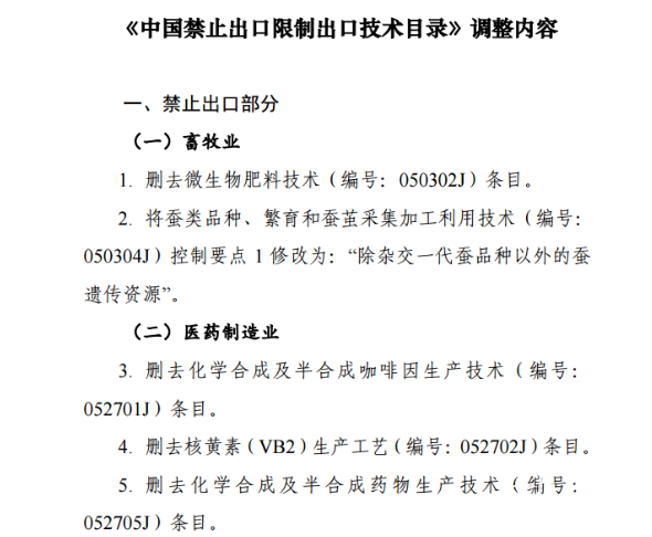8月28日,商务部、科技部发布《中国禁止出口限制出口技术目录》,其中对医药制造业做了如下规定: