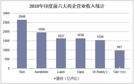 从印度的前六大药企营收来看,Sun、Aurobindo、Lupin、Cipla、DrReddy’s和Glenmark2018年合计销售额达到10404亿卢比,约合151亿美元,约合人民币1040亿元,最大的Sun的销售额达到265亿元。