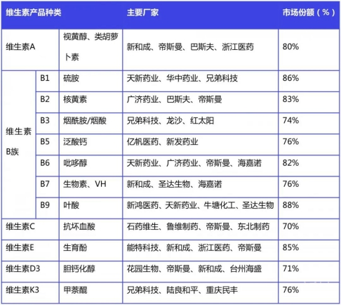 维生素市场需求相对稳定、应用较为普遍、规模较大的传统药品原料药。一般而言,各厂商的生产工艺、技术水平差别并不明显,生产成本控制是企业竞争的主要手段。由于毛利率高达40%-70%,企业进入行业厮杀的意愿自然是有的,事实上,各品类维生素均经历过非常激烈的市场竞争,实力较弱的企业已经在历史的杀戮中逐步退出,最后只留下集中度高的几大头部企业,它们占据大部分的市场份额。