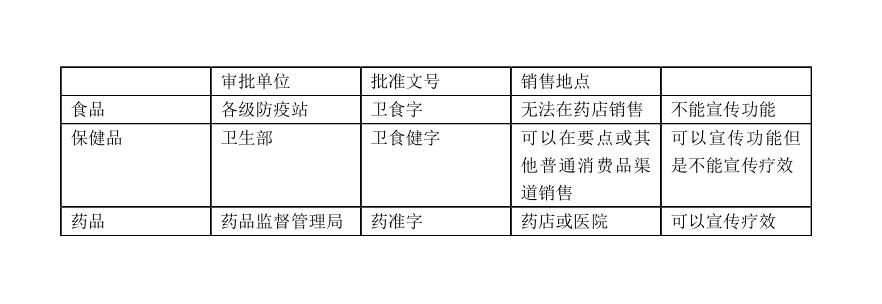 以我国为例,保健品的生产要求与食品行业标准一致,不同的是,保健食品需要通过卫生部的审查认证,或者资格证书。在审查上,保健品需要做的只是跟食品一样进行色泽、气味、理化指标、污染物等指标的审查,但在宣传上,保健品却可以进行功能性宣传。