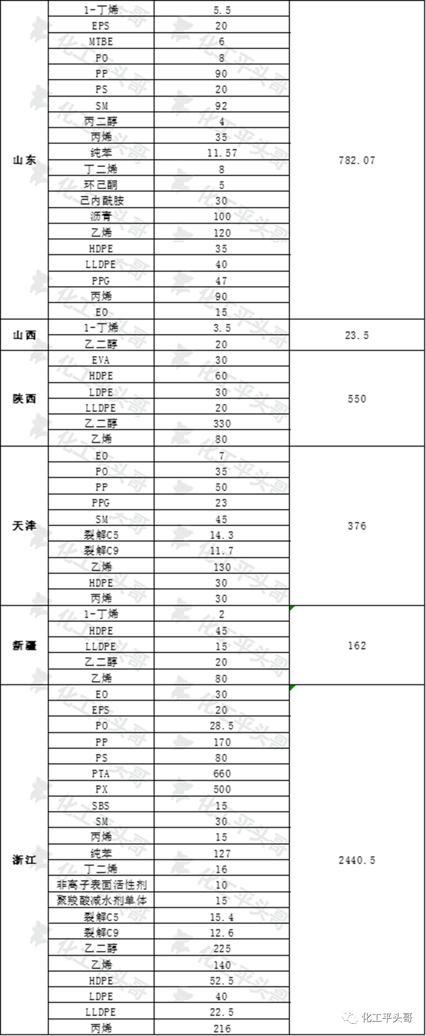 另外,江苏省在2021年也有较大规模的项目投产,其中包括盛虹炼化一体化、佳化化学等项目,其中盛虹炼化一体化项目,将是江苏省在2021年投产规模最大的化工项目,也将会带动江苏省数十种化工品的生产和销售。