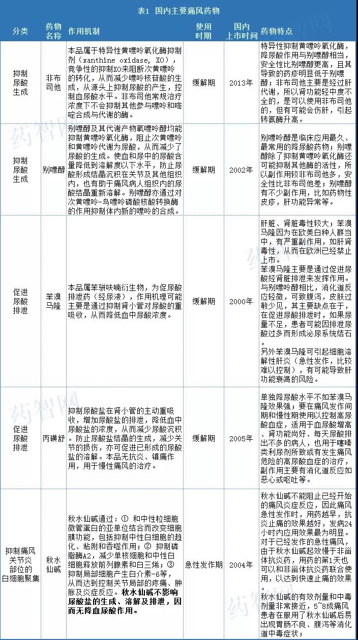 目前国内市场常用的痛风药分别是非布司他、苯溴马隆、别嘌醇、秋水仙碱和丙磺舒。2019《医保药品目录》收载非布司他、苯溴马隆、别嘌醇为乙类,秋水仙碱为甲类,丙磺舒被删减。