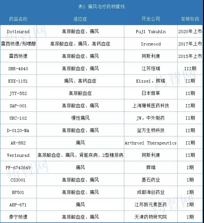 从现有治疗痛风的研究来看,有些药物已经过临床证实,具有较好的效果。但现有治疗痛风的药物种类仍非常欠缺,数量有限,且部分药物副作用明显,不具备很好的耐受性。现有处于临床研究阶段的管线也不多(表3)