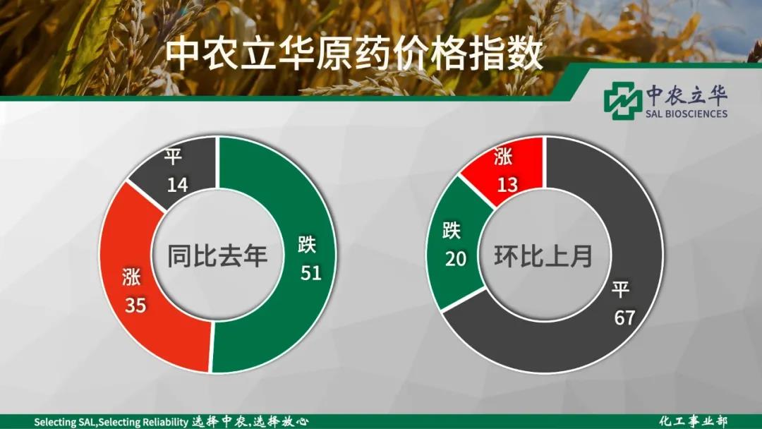 上涨:草甘膦原药、丁草胺原药、乙草胺原药、2,4-D原药、二甲戊灵原药、草铵膦原药、氰氟草酯原药、丙草胺原药、异丙草胺原药、异丙甲草胺原药、莠灭净可湿性粉剂、莠去津原药、灭草松原药、双草醚原药等 //04//杀虫剂
