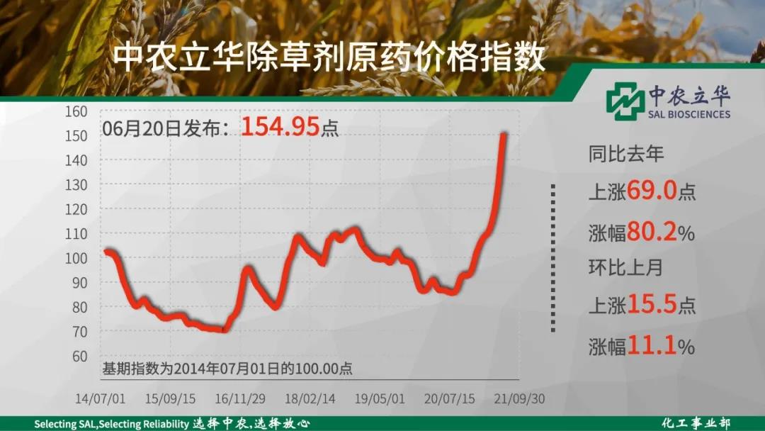 除草剂进入传统用药淡季,需求开始回落,但灭生性除草剂均大幅上涨。2021年06月20日中农立华除草剂原药价格指数报154.95点,其中草甘膦原药继续暴涨,创出近十年历史新高。