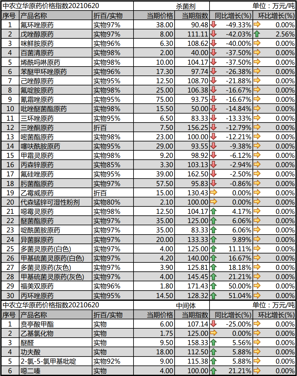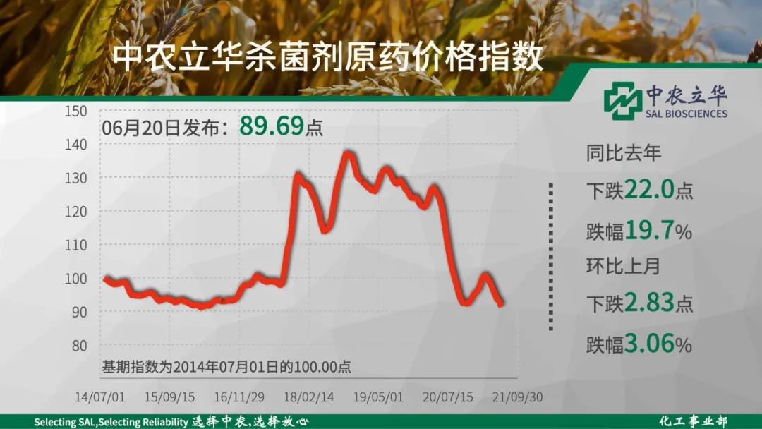 2021年06月20日中农立华杀菌剂原药价格指数报89.69点,环比上月大跌3.06%,三唑类是目前农药大类中,最为颓势的品种。仅丙环唑原药逆势上涨。上涨:噁霉灵原药、醚菌酯原药、啶酰菌胺原药、多菌灵原药、甲基硫菌灵原药、异菌脲原药、丙环唑原药、福美双原药、醚醛、功夫酸、2-氯-5氯甲基吡啶、噁二嗪等持平:乙霉威原药、代森锰锌可湿性粉剂、乙基氯化物等