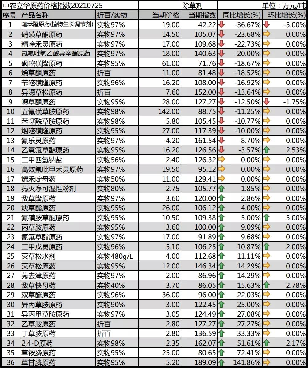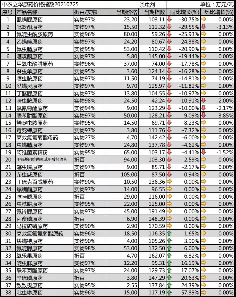 哒螨灵原药供应稳定,报价9.7万元/吨;螺螨酯原药市场流通价格报14万元/吨,供应稳定;炔螨特原药市场需求一般,但库存消化,市场报价到4万元/吨;茚虫威原药需求启动,开工率偏低,市场库存低位,目前价格稳定在105万元/吨。