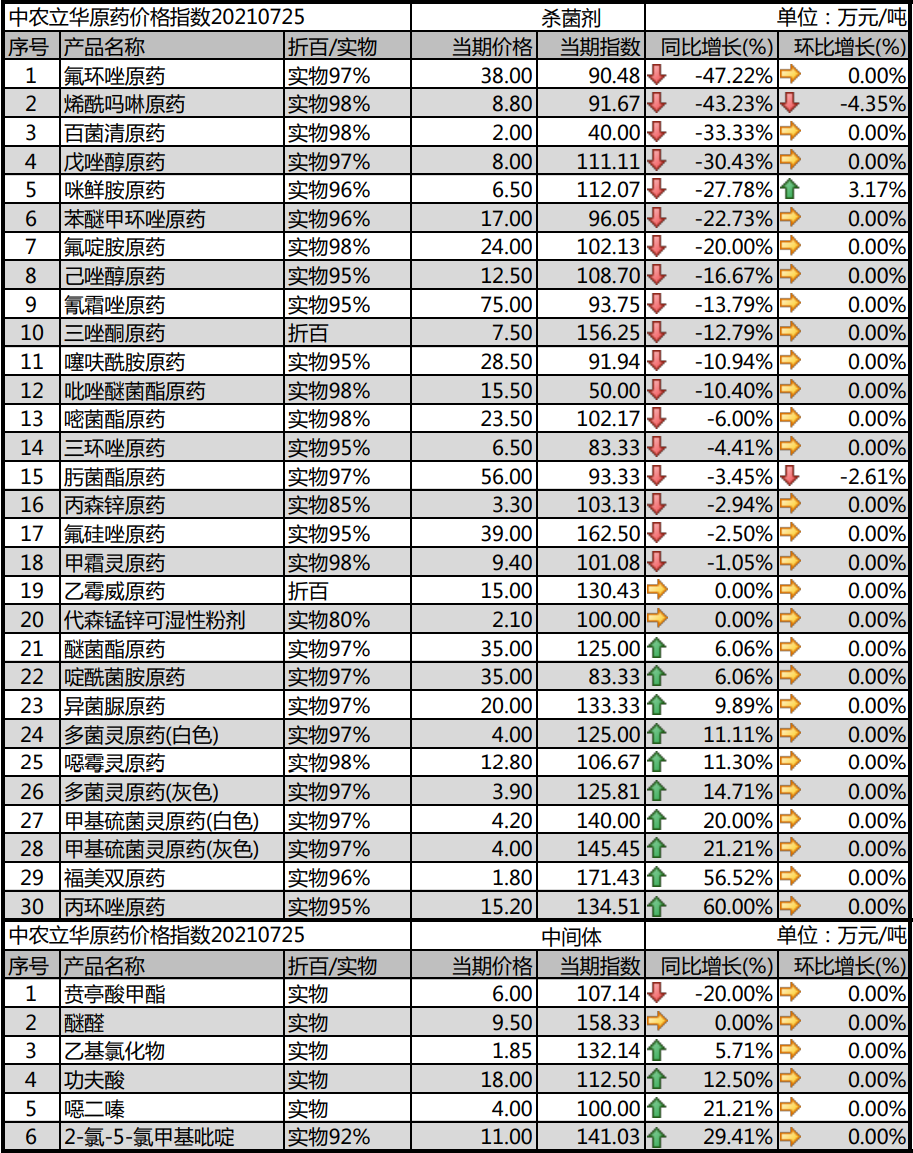 二甲戊灵原药目前进入用药淡季,但原材料高位,库存低位,报到5.1万元/吨。氟磺胺草醚原药进入淡季,工厂库存低位,原材料成本支撑明显,价格低位有所反弹,市场报价10.5万/吨。 乙氧氟草醚原药原材料上涨,带动成交价格上调,厂家库存消化,停车检修,目前市场价格报到16.2万元/吨;硝磺草酮原药随着上游供应的增加,市场库存较大,在用药淡季,市场价格维持在14.5万元/吨以内,各厂家竞争白热化。 灭草松原药厂家开工不顺畅,还未释放产量,市场库存较少,市场报价12万元/吨,灭草松水剂市场报价4万元/吨,市场几无库存;氰氟草酯原药进入用药季节尾声,但丙酸的价格高位,导致成本上升,市场报价17万元/吨;炔草酯原药市场同样受到此影响,叠加三氯吡啶的上涨,成本大幅上行,市场报价在26万元/吨;高效氟吡甲禾灵原药也受到上游原材料大幅上行影响,市场上行到19.5万元/吨。 烯草酮原药用药季节后期,但原材料价格高位,厂家开始淡储商谈,市场价格上涨到11万元/吨;异噁草松原药国内需求量大幅萎缩,进入淡季,国内市场低含量货源价格报到7.6万元/吨;噻苯隆原药市场报价19万元/吨,受开工率提升影响,价格有所下滑;砜嘧磺隆原药市场报价61万元/吨,开车厂家少,消化库存为主,库存逐步降低。 精喹禾灵原药终端市场性价比较低,用药淡季,需求弱势,市场报价到17万元/吨;烟嘧磺隆原药用药淡季,价格报到27万元/吨;氯氟吡氧乙酸异辛酯原药需求一般,市场报18万元/吨。 酰胺类除草剂市场用药淡季,受原材料高位影响,目前价格维持高位。丙草胺原药价格报到3.6万元/吨;乙草胺原药报到2.7万元/吨;丁草胺原药报到2.8万元/吨;异丙草胺原药报3万元/吨;异丙甲草胺原药报到3.05万元/吨;苯噻酰草胺原药报5.8万元/吨,市场稳定。