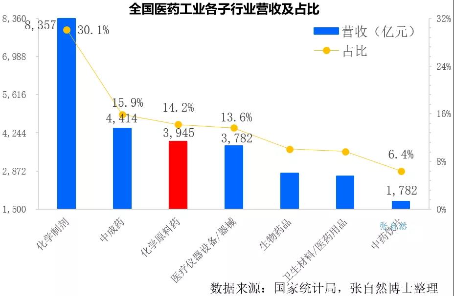 2020年,我国化学原料药实现营收3945亿元,占全国医药工业整体营收的14.2%,位居第三位,仅次于化学制剂和中成药两大支柱产业;同期,化学制剂和中成药分别实现了8357亿元和4414亿元的营收,占比分别为30.1%和15.9%。