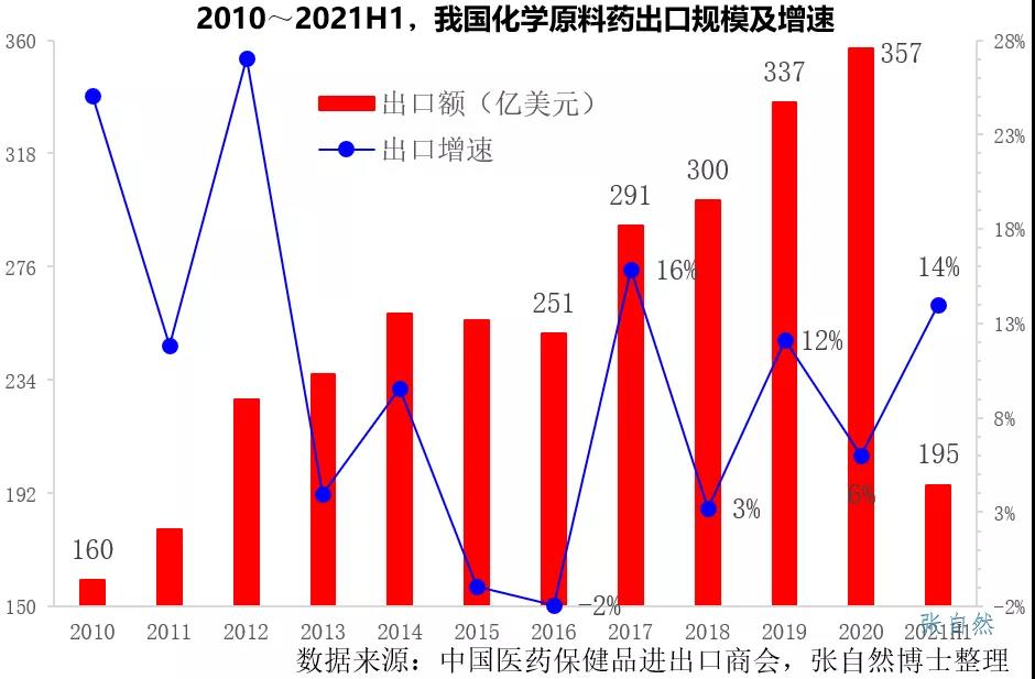 据中国医保商会初步统计,2021年上半年,我国原料药出口额达到195亿美元,同比增长14%,但主要源自出口均价上涨18%驱动,就数量而言,出口同比反而减少了4%。主要是因为2020年下半年以来,全球大宗原材料价格和跨境物流费用的单边上涨所致,属于增收不增利,这也反映了全球原料药需求有一定程度的下滑。