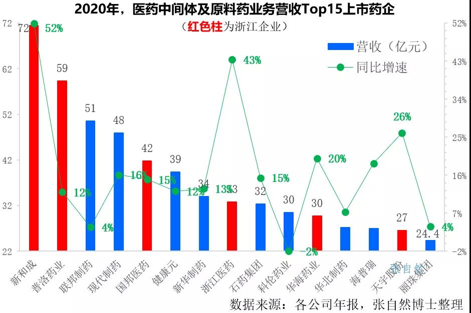 我国现有原料药上市公司近40家,从原料药上市公司的主营业务构成中摘取原料药和中间体的营收进行排序,发现Top15药企基本都保持了10%以上的增长速度,并稳居行业领先地位。Top15药企中,浙江省占了6家(如图4中的红色柱所示),其中包括全国营收最大的企业新和成。2020年,新和成的原料药和中间体销售达71.52亿元,其增速也最快,较其2019年47.08亿元的营收增长了51.91%;普洛药业规模第二,2020年其原料药和中间体业务实现营收59.31亿元,同比增长了12.03%;浙江医药增速位居第二位,2020年比上年同期增长了43.35%。此外,浙江省占了全球Top10原料药生产商中的4席。目前,浙江临海已建立国家级浙江省化学原料药基地,也是全国化学原料药和医药中间体产业开始最早和规模最大的集聚区。可以推断,浙江在我国乃至全球化学原料药行业将长期扮演重要角色。