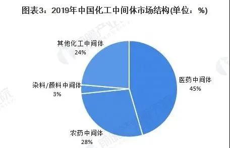 在市场结构方面,经过测算,目前我国化工中间体中医药中间体市场规模占比最大,达45%,农药中间体市场规模占比达28%,染料/颜料中间体市场规模占比为3%,其他类型的化工中间体占比为24%。