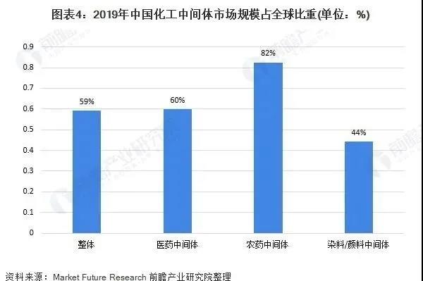 从我国化工中间体市场的全球竞争力来看,2019年我国化工中间体市场规模占全球市场规模的比重达59%,其中医药中间体市场规模占全球市场规模的比重达60%,农药中间体市场规模占全球规模的比重达82%,染料/颜料中间体占全球市场规模的比重达44%。