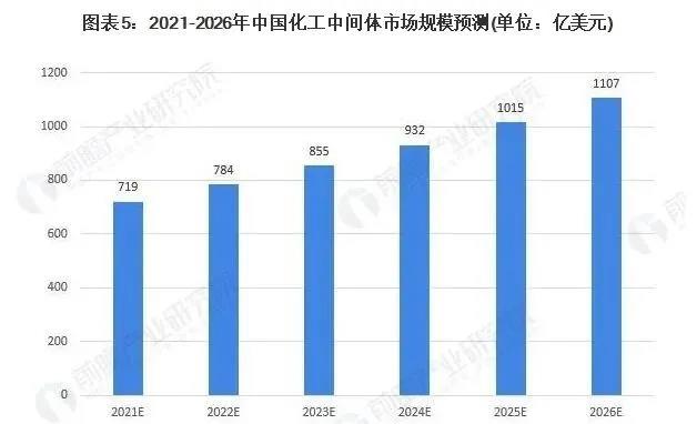 在市场方面,农业、医药等方面的大型市场仍然会提高化工中间体的市场规模,预计到2026年我国化工中间体市场规模约为1107亿美元。