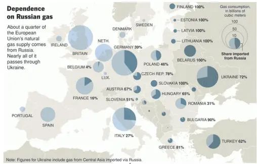 天然气除了是重要的工业原料外,同时也是非常优质的燃料。目前,欧洲天然气严重依赖于盛产天然气和石油的俄罗斯,约有35%的用量来自俄罗斯。而俄罗斯通过一系列关键管道与欧洲能源市场相连,其中最大的一条管道途经乌克兰,这也成为双方在日益严重的危机中的瓶颈。