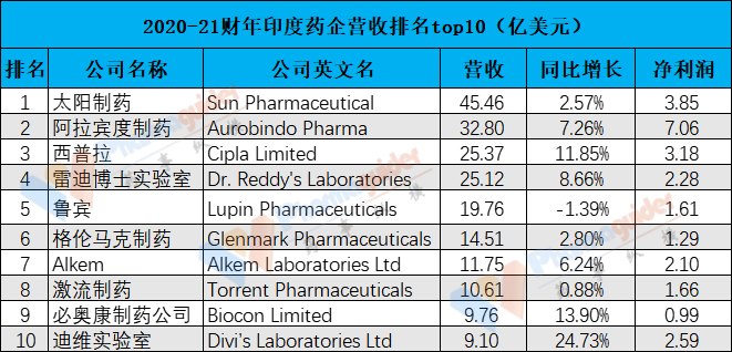 印度top10药企营收在9-45亿美元。其中太阳制药2021年营收45.46亿美元,排名第一。
