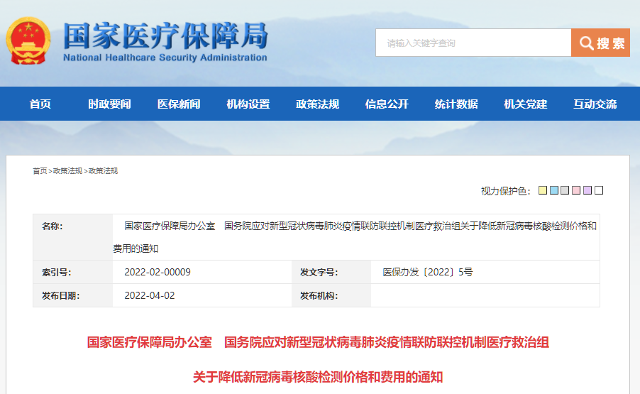 5月25日,国家医保局办公室、国务院应对新型冠状病毒肺炎疫情联防联控机制医疗救治组印发《关于进一步降低新冠病毒核酸检测和抗原检测价格的通知》(简称《通知》),要求各地在6月10日前将新冠病毒核酸检测单人单检降至不高于每人份16元,多人混检降至不高于每人份5元。