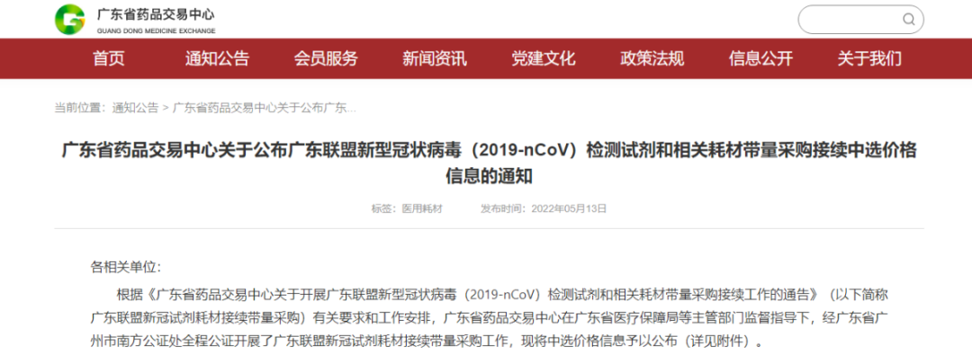 5月13日,广东省发布新冠检测试剂、耗材等相关产品联盟带量采购接续工作的通知。本次中选结果:普通核酸最低报价3.2元,抗原自测最低报价3.91元。