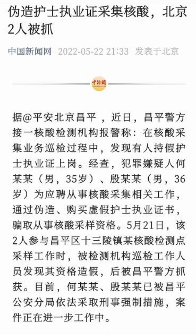 北京市公安局昌平分局官方微博发布消息,近日昌平警方接一核酸检测机构报警称:在核酸采集业务巡检过程中,发现有人持假护士执业证上岗。经查,犯罪嫌疑人何某某(男,35岁)、殷某某(男,36岁)为应聘从事核酸采集相关工作,通过伪造、购买虚假护士执业证书,骗取从事核酸采样资格。