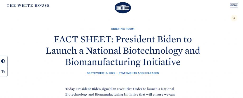 9月12日,白宫官网发布简报,宣布美国总统已签署了一项鼓励美国生物技术生产和研究的行政命令。