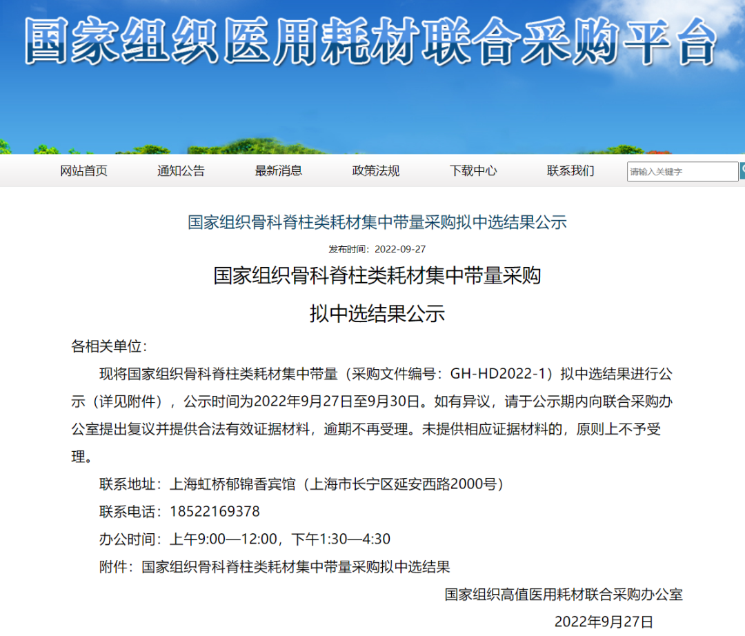 9月27日,国家组织骨科脊柱类耗材集中带量采购在上海接受企业递交申报材料并现场开标。晚间,国家组织高值医用耗材联合采购办公室官宣国家组织骨科脊柱类耗材集中带量采购拟中选结果(详见文末表格)。