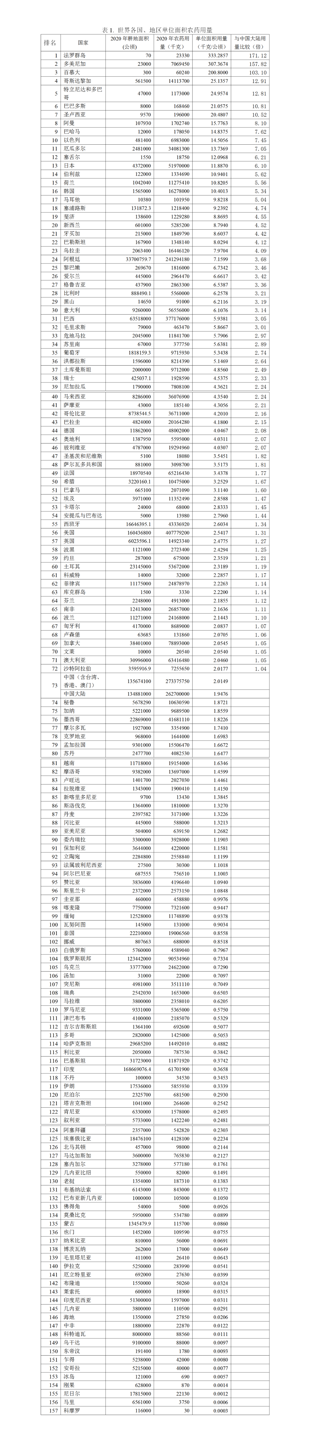非洲以南非的用量最高,为2.1636kg/公顷,是中国的1.11倍。