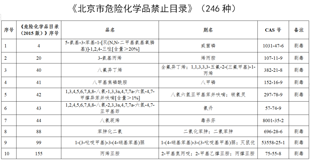 八甲磷、克百威、毒鼠强、水银等246种危化品拟被列入禁止目录,在北京行政区域内禁止生产、储存、使用、经营和运输(含过境运输)。确需使用且符合首都功能定位和产业发展需求的,只能以符合要求的化学试剂包装和气瓶气体形式使用和运输。