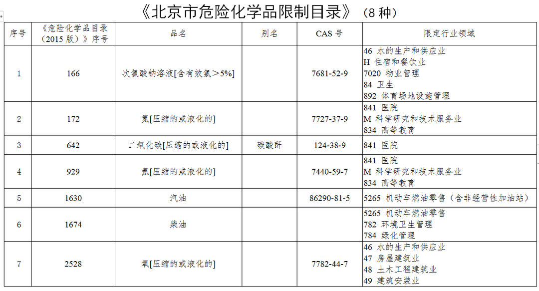 限制目录所列危化品共计8种,包括汽油、柴油、氦等,本市鼓励以化学试剂包装和气瓶气体形式使用和运输。其中,首都功能核心区和城市副中心区域只允许这8类危化品在限定行业领域使用,并以特定的专用罐车、厢式货车或专用运输车辆的方式运输。未列入的其他危化品,可以符合要求的化学试剂包装和气瓶气体形式使用,并只可通过厢式货车运输。