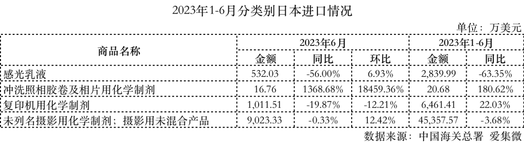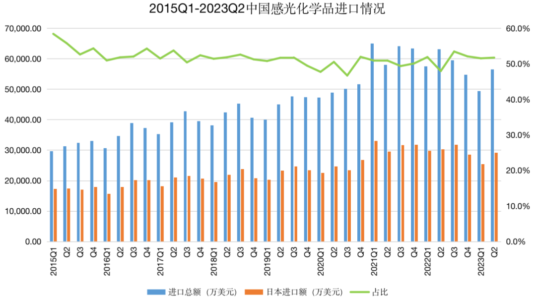 日本是全球光刻胶的主要生产地,近10年来,我国从日本进口的光刻胶占比一直超过50%,尤其在高端光刻胶领域更是重度依赖日本进口。据中国海关总署数据,2022年我国感光化学品进口总额23.50亿美元,从日本进口额12.05亿美元,占比51.3%。2023年1-6月份,从日本进口额为5.47亿美元,同比下降9.1%,6月份进口额为1.06亿美元,同比下降8.2%,环比增长9.4%。