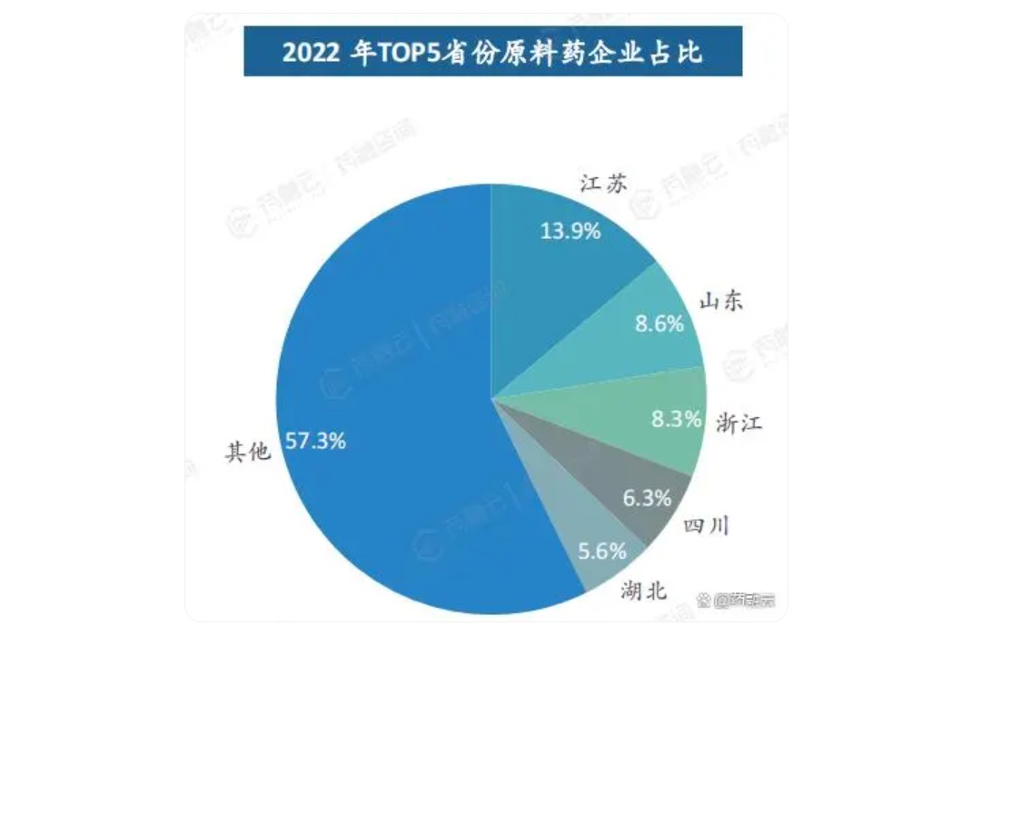 其中,企业数>100家的有4省,分别为江苏(224家)、山东(138家)、浙江(133家)、四川(101家),4省合计占全国原料药企业总数的近四成(37%)。