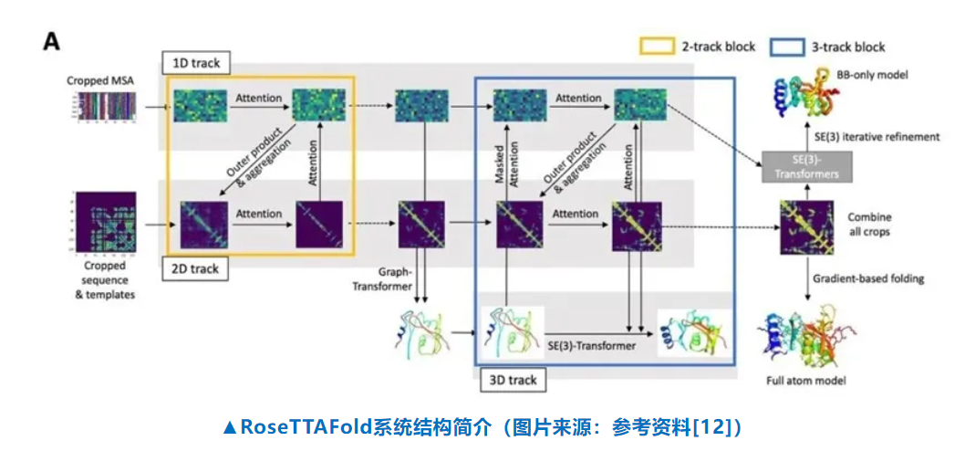 2003年,Baker的团队设计出了第一个原本并不存在于自然界中的蛋白质,它被命名为Top7。这当然是一个重要突破,但却没有开辟一个崭新的时代。Baker实验室的成员开玩笑说Top7只是一块从热力学角度上看很稳定的“石头”。因为他们从头设计出的这个蛋白质虽然折叠成了研究人员们想要它折叠的模样,但不具有任何功能。7年后,Baker的一名博士后研究员做出了改进。他将抗体的一部分连接到了人造蛋白上,使人造蛋白首度具有了功能:新合成的蛋白能识别流感病毒,有望成为一种新的药物,但这多少有些“作弊”的意思,毕竟最重要的那部分来自天然的抗体。接下来的几年时间,Baker的团队对Rosetta进行了更多的优化。如今,Baker的实验室,以及他的合作伙伴们已能设计出多种不同的蛋白,有朝一日,人类完全获得“上帝之手”的能力将不再是梦想。不过到目前,从头设计蛋白依然是一个不断试错的工作,需要大量的资源投入。以设计结合蛋白为例,从流程上看,科学家会首先用Rosetta模拟出所感兴趣蛋白表面上的一个“口袋”,然后再设计出大量不同的螺旋结构,形成稳定骨架。这些骨架上含有一些特定的氨基酸,有可能会与“口袋”进行完美的契合。这个工作就像是在一把钥匙上不断打磨,最终使其完美地对应一把锁。随后,研究人员们会根据设计合成所要的DNA序列,将其引入细菌细胞,期望它们能够产生所需要的蛋白。获取这些蛋白后,他们还会做两个测试:评估这些蛋白是否能如预期般折叠,以及折叠后的蛋白是否能如预期般结合特定蛋白。通常来讲,人工设计的蛋白极少能同时满足这两个条件。而那些脱颖而出的蛋白,则会成为新一轮设计与筛选的起点,直至获得最佳的构象。在2018年以前,Baker及其团队开发的Rosetta在蛋白质结构预测领域完全没有对手。而那一年,AlphaFold的出现令Baker嗅到了危机。尽管18年的蛋白质结构预测竞赛依然是Rosetta拔得头筹,但首次亮相就获得了第二名的AlphaFold令Baker见识到了机器学习的过人之处。于是,他要求团队紧跟时代的风向,加紧研究机器学习。Baker的预感没有错,在2020年的竞赛中,第二代AlphaFold击败了Rosetta,一举成名。不过,Baker率领着团队很快就追赶了上来。2021年7月15日,当DeepMind公司在《自然》杂志上发表论文,公开了“AlphaFold2”的源代码,并且详细描述了它的设计框架和训练方法时,Baker的团队也于《科学》杂志上介绍了其开发的RoseTTAFold算法。RoseTTAFold的神经网络能够同时考虑蛋白序列的模式、蛋白中不同氨基酸之间的相互作用,以及蛋白质可能出现的3D结构。在这个系统中,一维、二维和三维的信息能够相互交流,让神经网络综合所有信息,决定蛋白质的化学组成部分和它折叠产生的结构之间的关系。