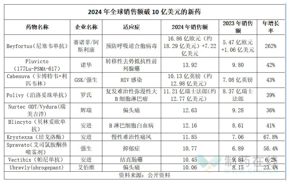 随着MNC财报的公布,2024年首次进入重磅行列的新药也逐渐显现。据不完全统计,2024年10款新药全球销售额首次突破10亿美元,其中安进占据3款。适应症上,4款用于肿瘤,2款用于治疗偏头痛,其中治疗偏头痛的2款药物均属于口服降钙素基因相关肽(CGRP)受体拮抗剂。药物类型上,单抗和化药各占据4款,核药1款,酶类1款。年增长率上,Beyfortus增长较快,销售额较2023年翻倍。